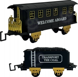 To detaljerede vogne medfølger – en kulvogn og en personvogn. De kobles nemt på og kører jævnt på banen.