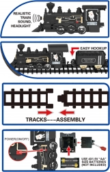 Lokomotivet med lysende forlygte og autentiske damptogslyde skaber en fængende atmosfære og drager børn ind i legen.