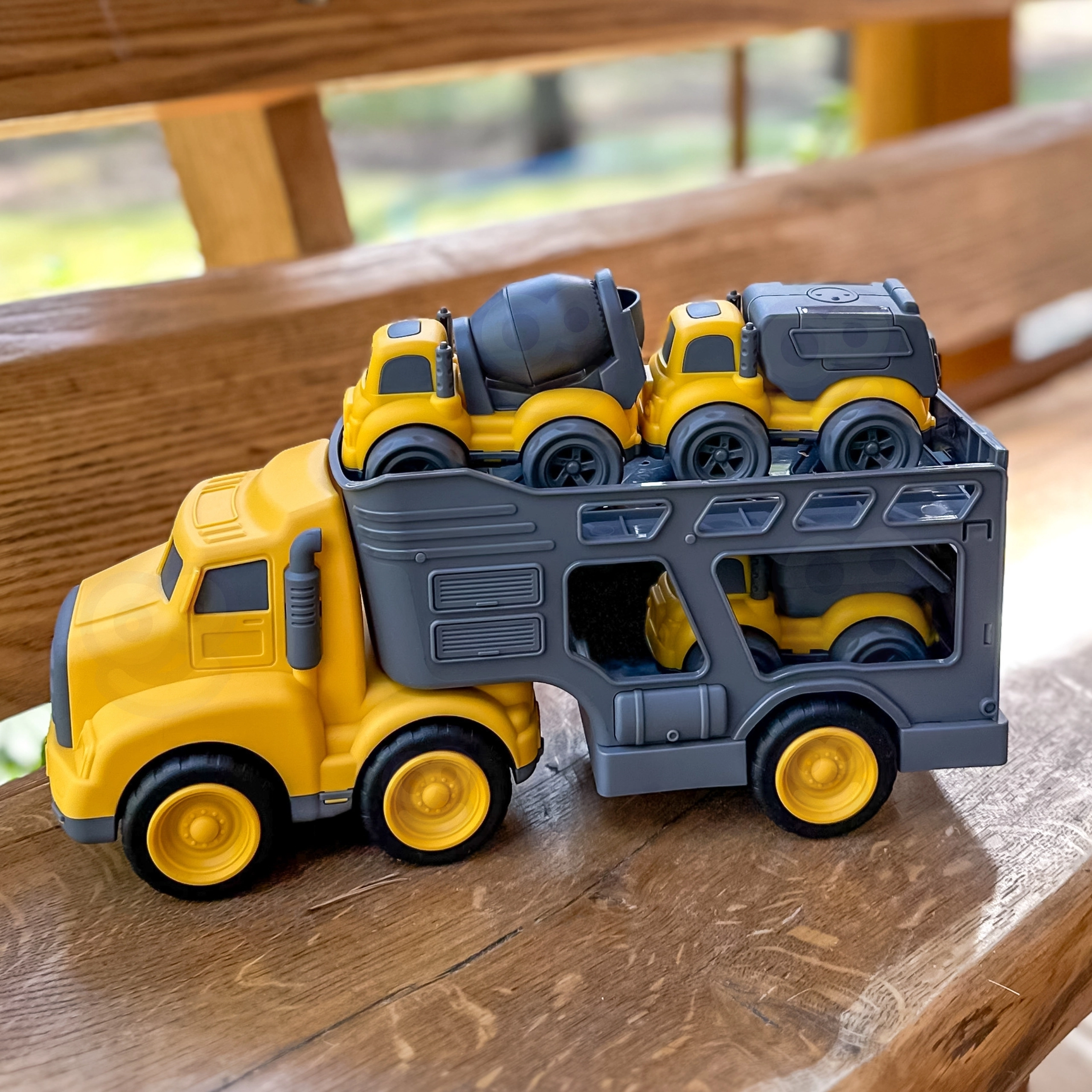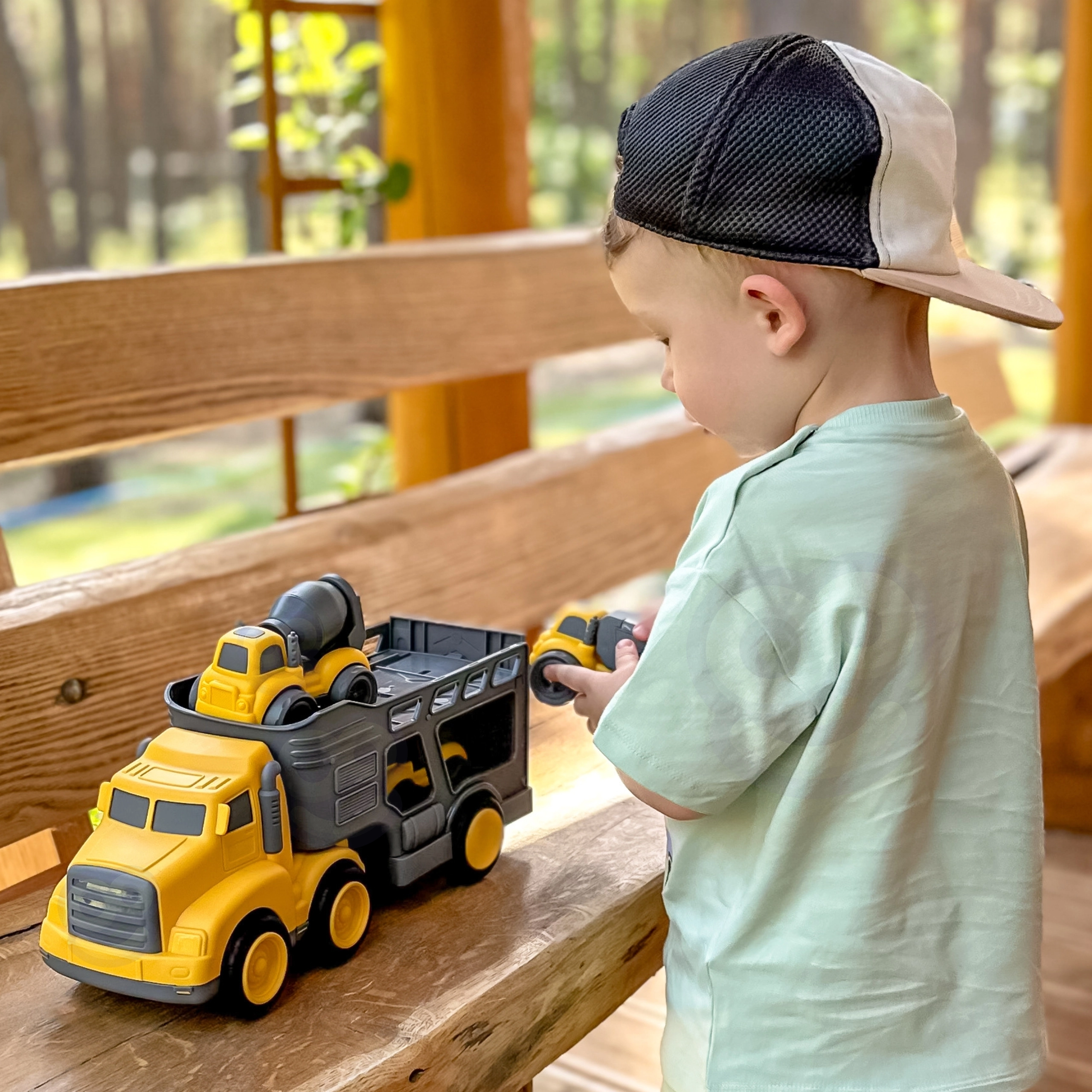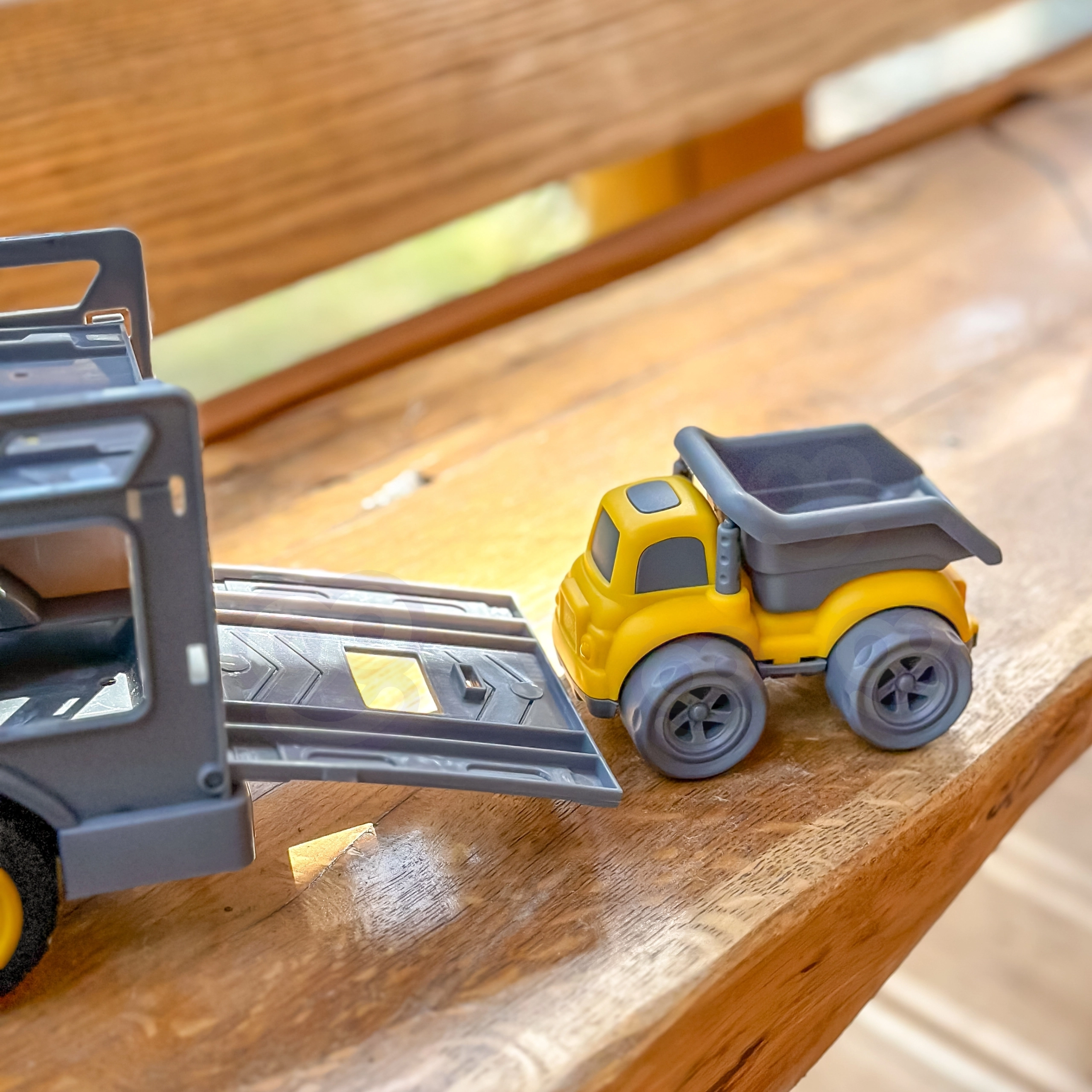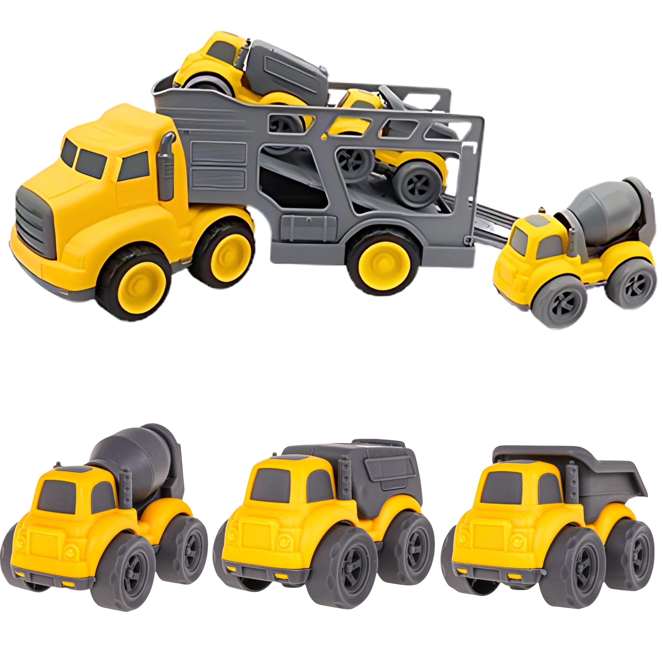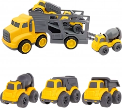 Dette alsidige 4-i-1 sæt fra WOOPIE bringer byggens verden direkte ind på børneværelset. Den store bugseringsvogn med aftagelig platform transporterer let tre kompakte køretøjer, som med bevægelige dele og friktionsdrev i de små biler understøtter aktiv leg og udvikling af fin- og grovmotorik.
