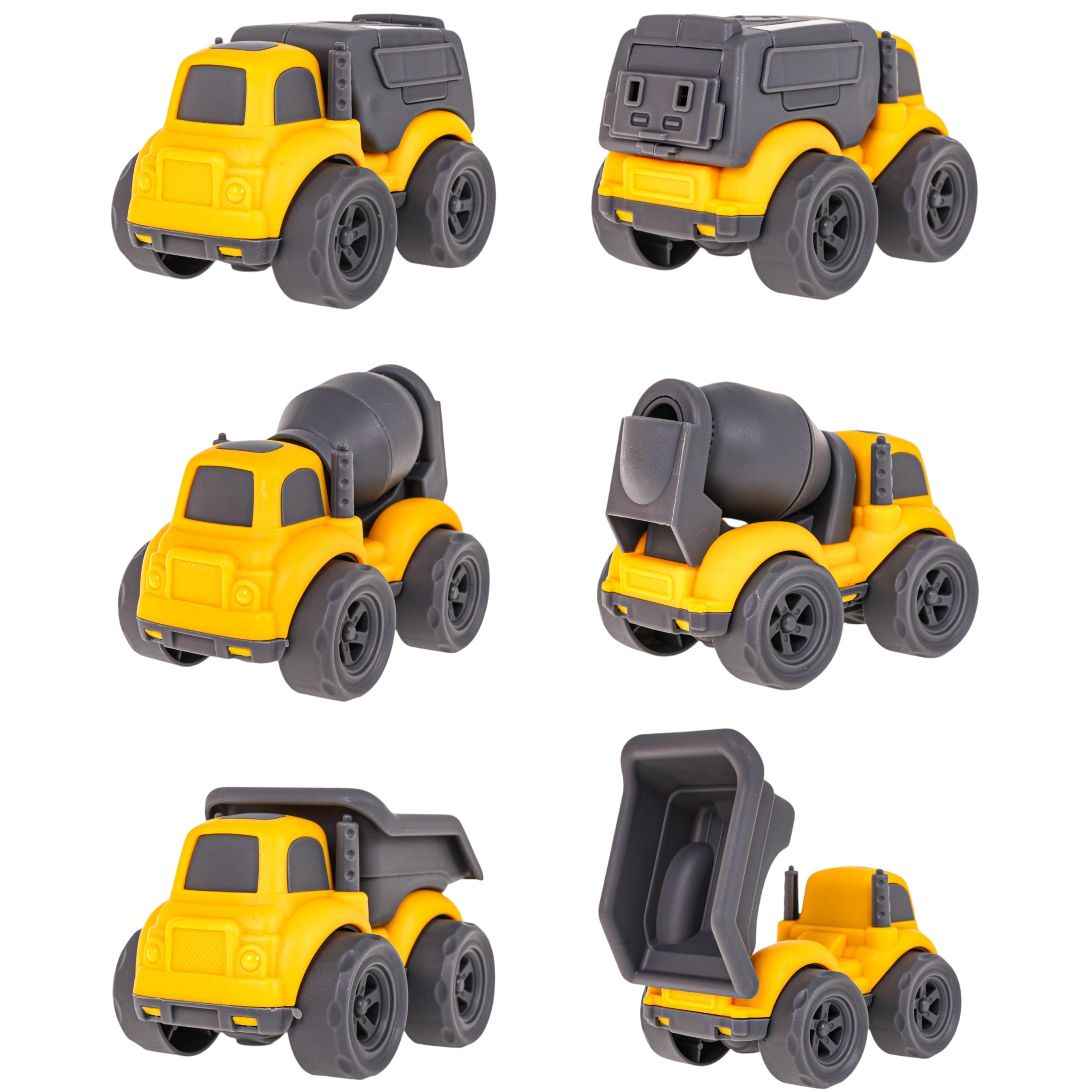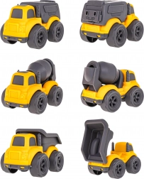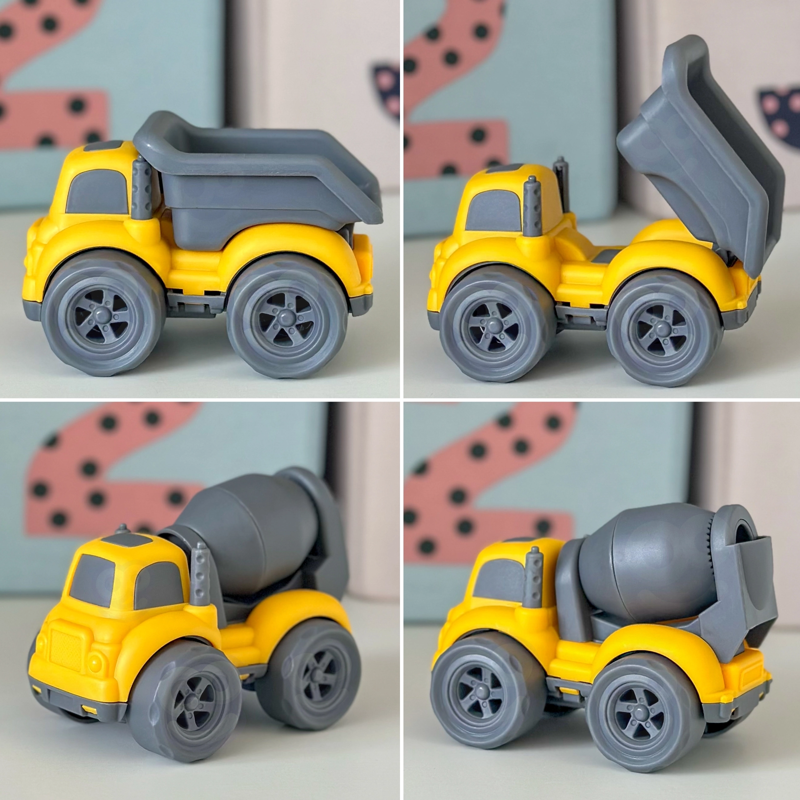 Tipvogn med vippelad, cementblander med roterende tromle og skraldebil for endnu mere realistiske scenarier på byggepladsen.
