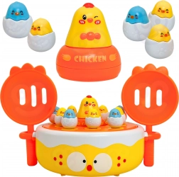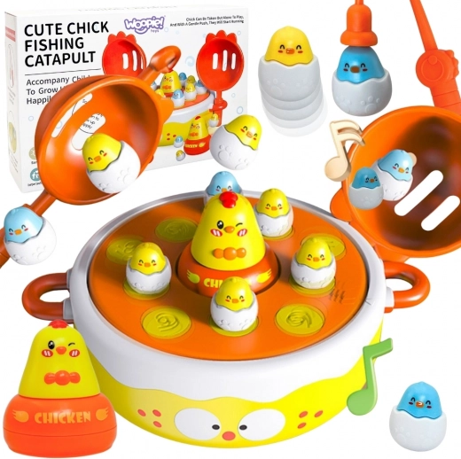 Basen med melodier og rotation lader kyllingerne “springe op” tilfældigt, så børn træner reaktion og koordination, når de fanger dem.
