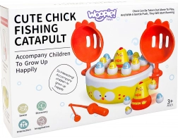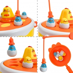 Denne alsidige legetøjspakke kombinerer op til fire lege i ét sæt, så børnene ikke løber tør for sjov foreløbigt. Den roterende base med musik løfter tilfældigt kyllingerne, som kan fanges med den magnetiske stang eller gribes med skovlene efter affyring fra katapulten. Den større aftagelige kylling kan bruges som en legesyg lille bil.