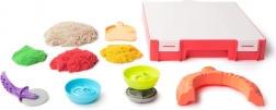 - 450 g kinetisk sand i 4 farver, 2 presser, 3 værktøjer, æske/legeflade