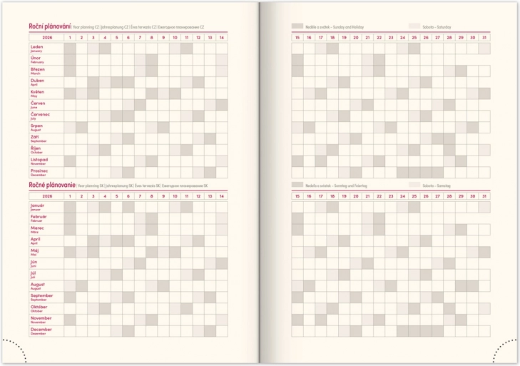 - Kalendarium: fra december 2025, ugentligt layout med tjekkisk, slovensk og andre sprog som engelsk, tysk, ungarsk og russisk.