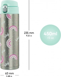 Nyd stil og funktionalitet med denne termoflaske, som tilbyder enkel åbning og en integreret silikondrikketud. Med et volumen på 450 ml er den perfekt til daglig brug. Flasken fås i flere legende designs, som nemt kan matches med andet skoleudstyr.