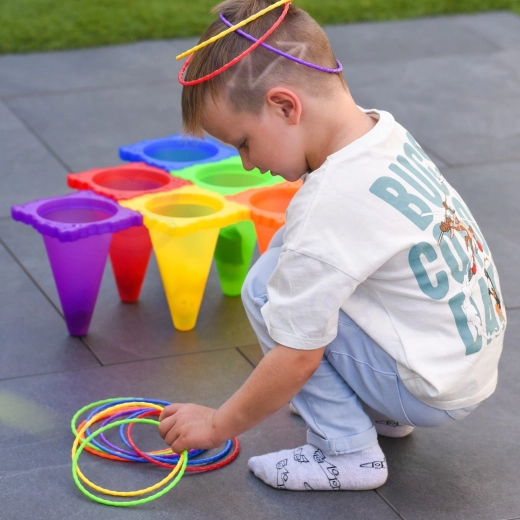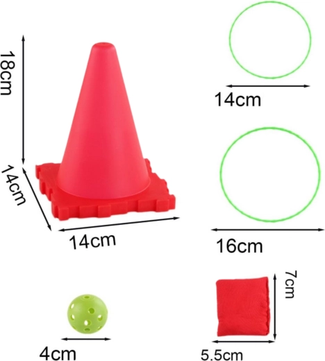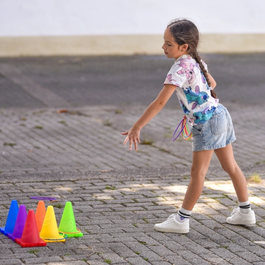 Nyd aktiv sjov for hele familien med det alsidige WOOPIE 3 i 1-sæt. Modulære kegler med gennemgående huller og stabelbare baser muliggør forskellige opsætninger til træning af præcision, hastighed og reaktion. Børn øver farver, pointtælling og samarbejde – voksne vil sætte pris på fleksibiliteten og den nemme opbevaring.