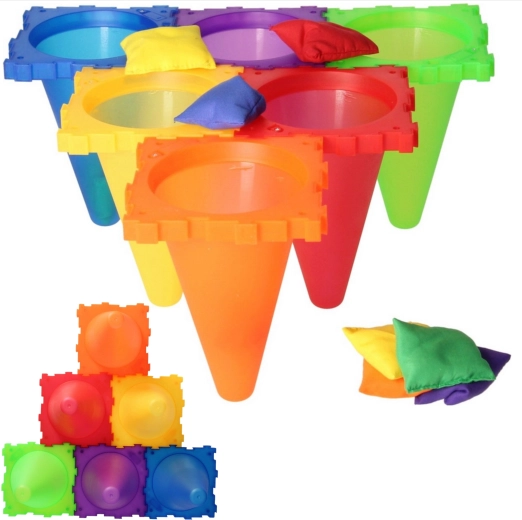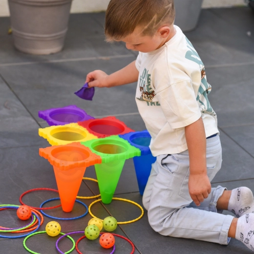 I sættet finder du alt til tre populære spil: toss med bolde i kegler, bean bag toss i mål og ring toss på kegler. Takket være den lette og sikre konstruktion egner det sig til udendørs og indendørs brug. Klare farver øger synligheden og motiverer til bevægelse.