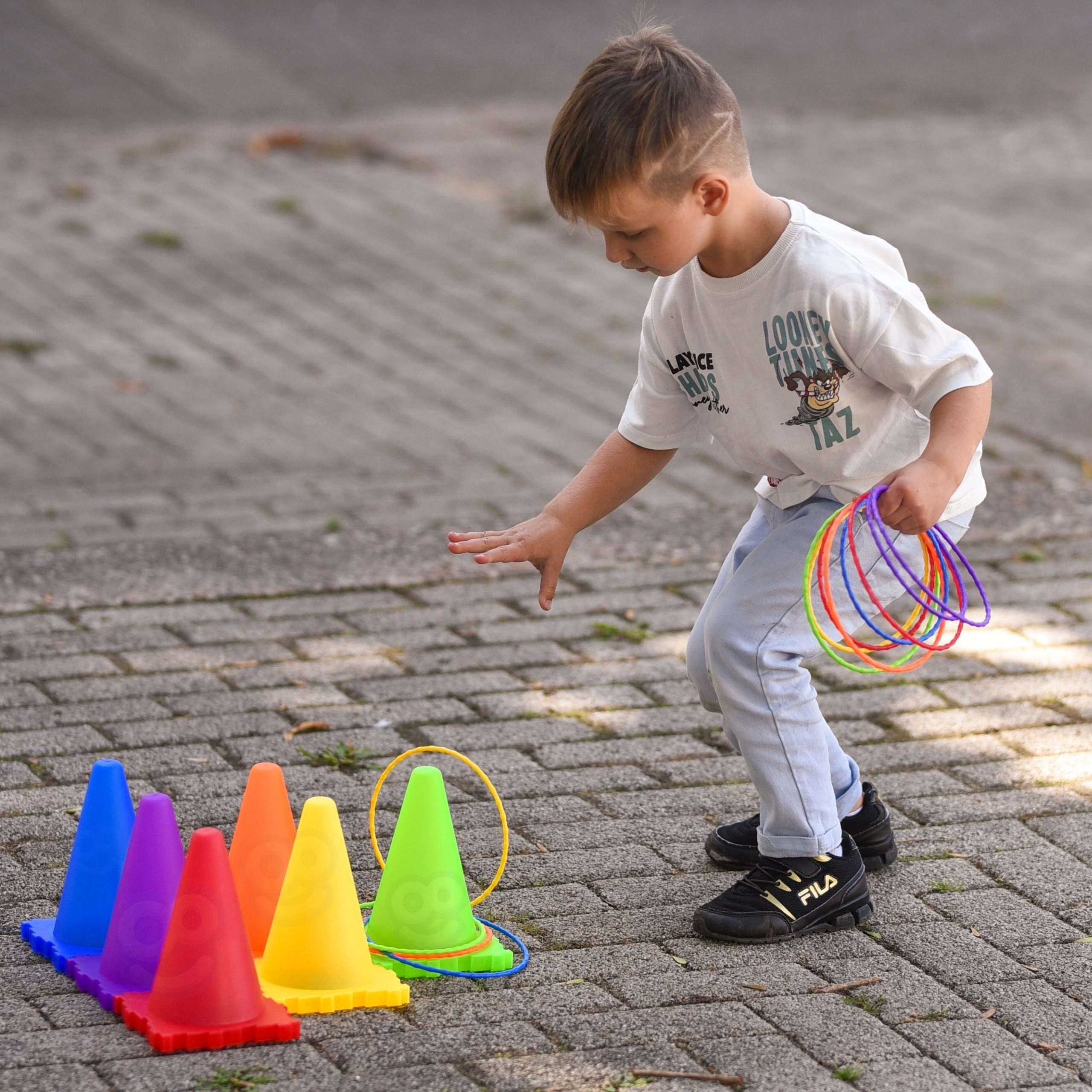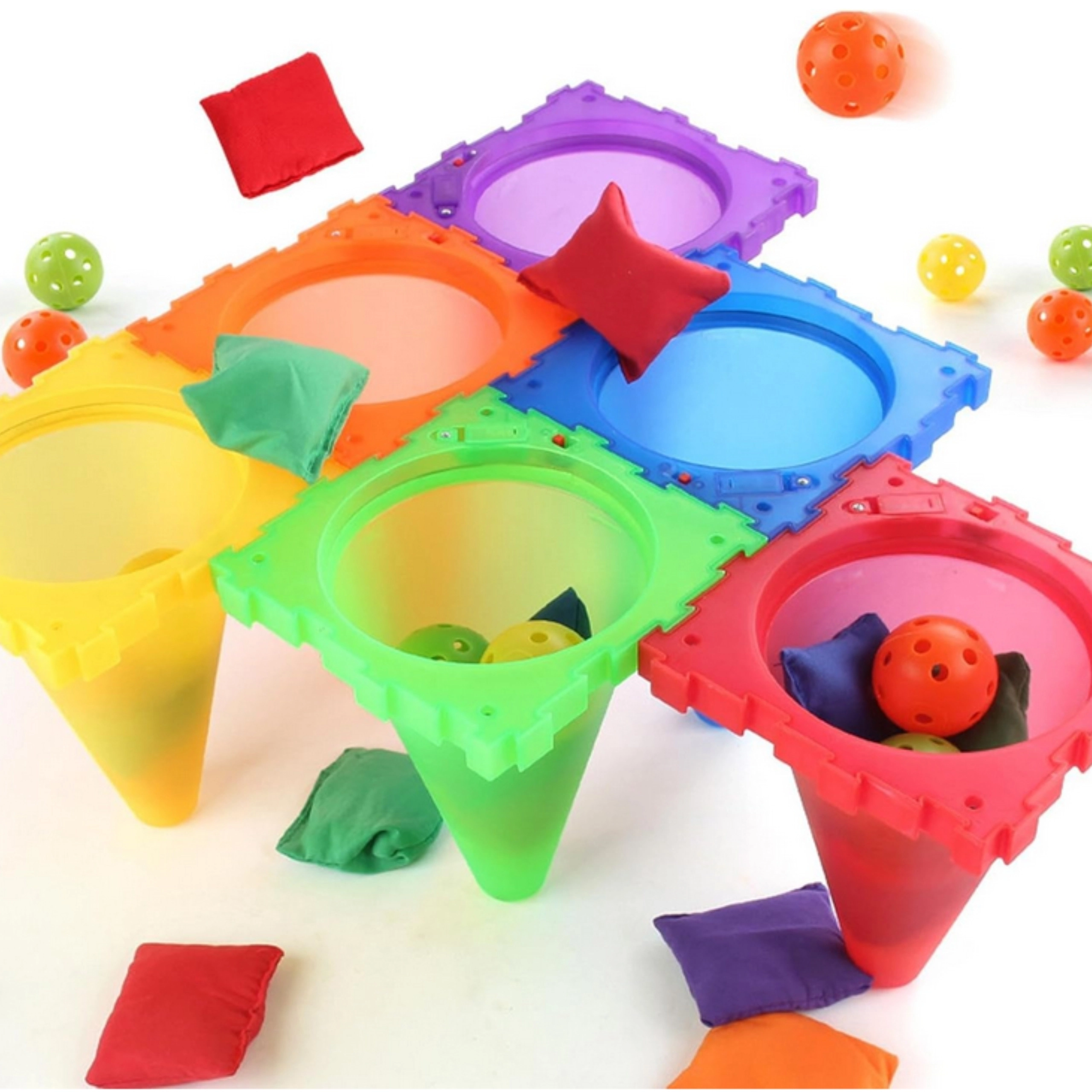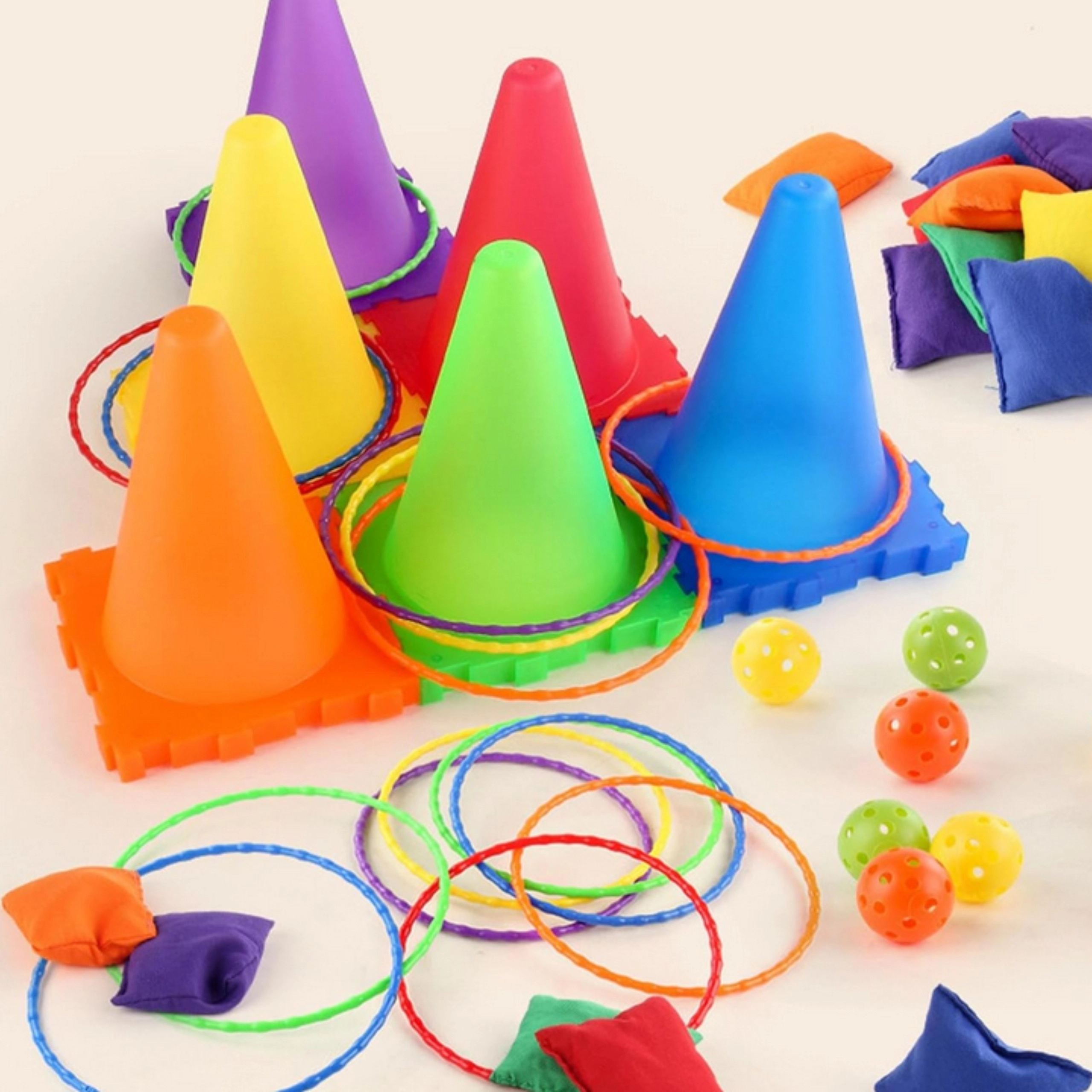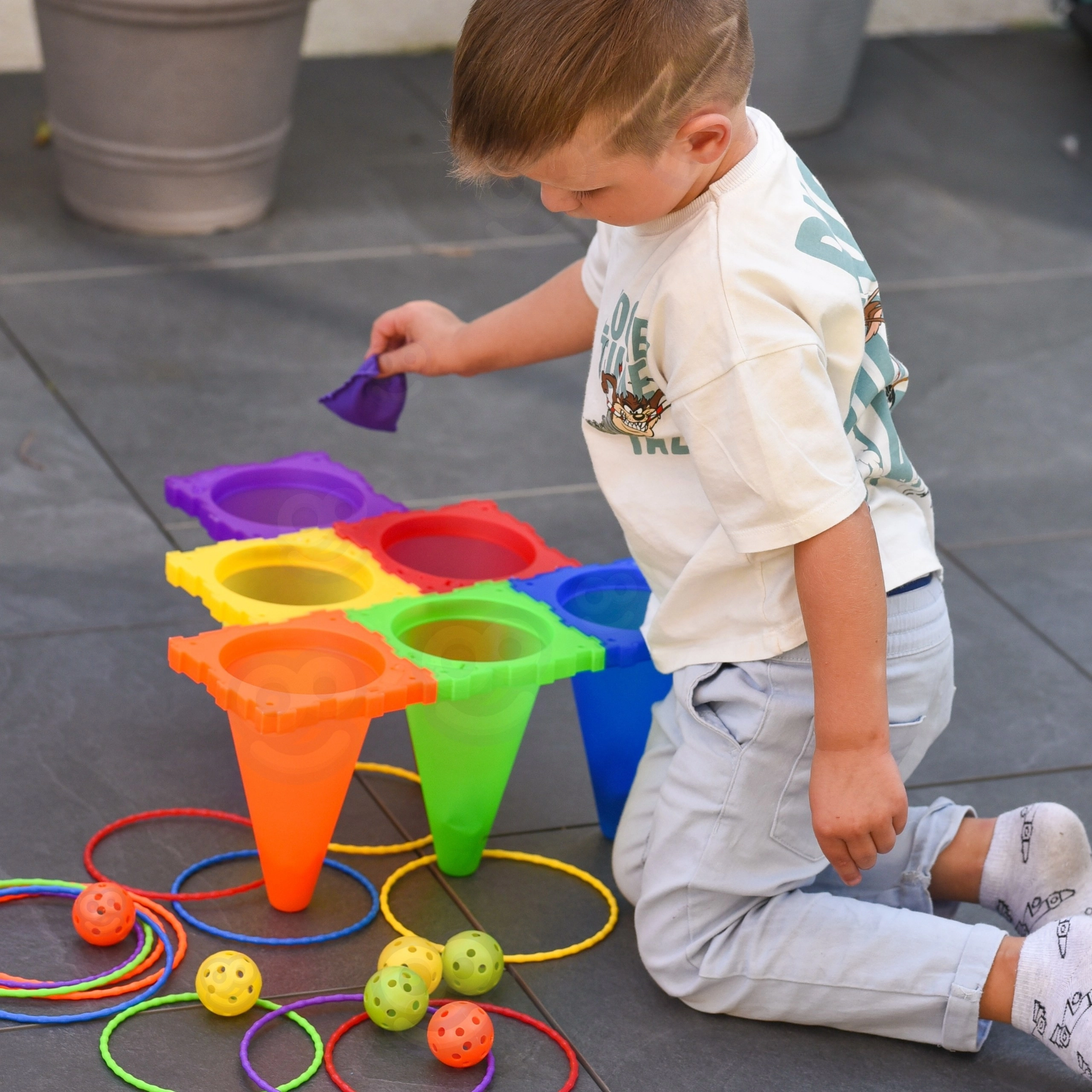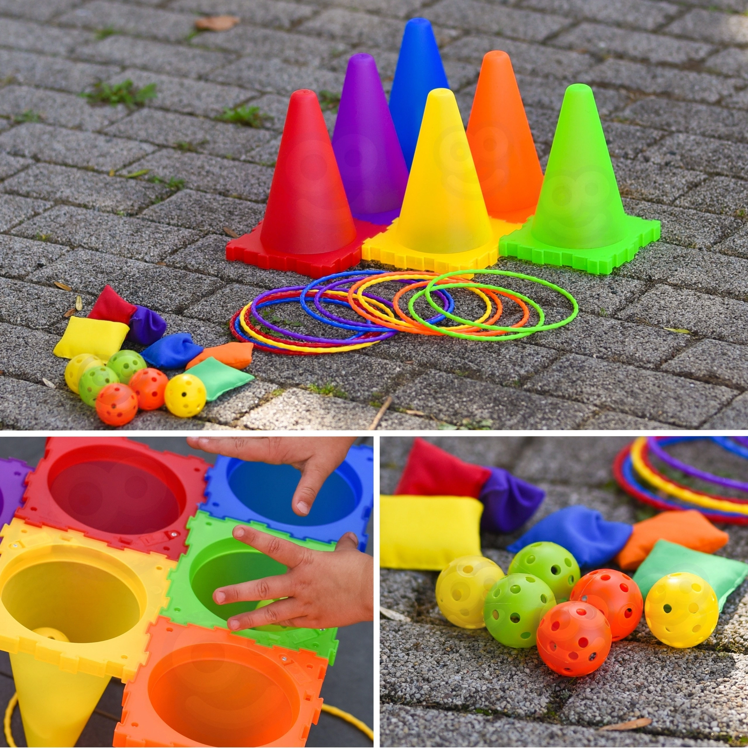 - stabelbare kegler, perforerede bolde, klare farver, egnet til indendørs og udendørs brug