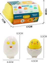 Hvert æg består af to dele: en øverste skal og en nederste skal, som er forbundet med en kyllingefigur. Barnets opgave er ikke kun at matche den rigtige æggeskal, men især at placere den det rigtige sted i formen. Hvert æg har på undersiden en unik geometrisk form, som passer til en åbning i æskeformen. De sjove ansigter er en fantastisk måde at lære børn at genkende og navngive følelser.