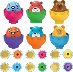 Sættet indeholder seks farverige æg, indeni hvilke du finder glade dyr. Barnets opgave er ikke kun at åbne ægget, men især at placere det på den rigtige plads i den særlige holder. Hvert æg har i bunden en unik geometrisk form, der passer til en af åbningerne i bakken. Når man trykker på dyrefiguren, aktiveres en lydeffekt. De glade ansigter på skallerne er en fantastisk måde at lære børn at genkende og benævne følelser.