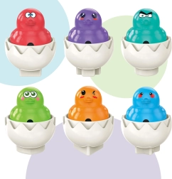 Legeæg fra mærket Woopie introducerer dit barn til en verden fuld af farver, former og glade ansigter. Hvert af de seks søde æg gemmer på en farverig kylling med et sjovt udtryk, og når man trykker på det, afgiver det en lydeffekt. Målet er ikke kun at samle den rigtige skal, men også at placere den på det rigtige sted i bakken.