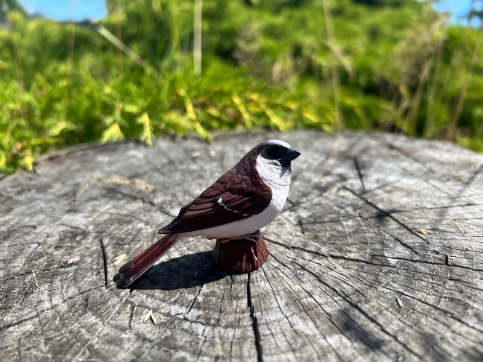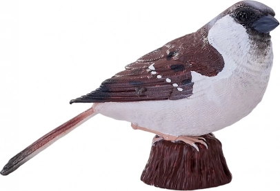 Omhyggelig modellering og håndmaling fremhæver gråspurvens realistiske træk – fra fjerstruktur til autentiske farver.