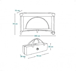 Produktet indeholder også en praktisk transporttaske, som beskytter sengen mod snavs og gør den nem at transportere og opbevare. Der er også en mobil lomme til ekstra bleer, legetøj eller vådservietter.