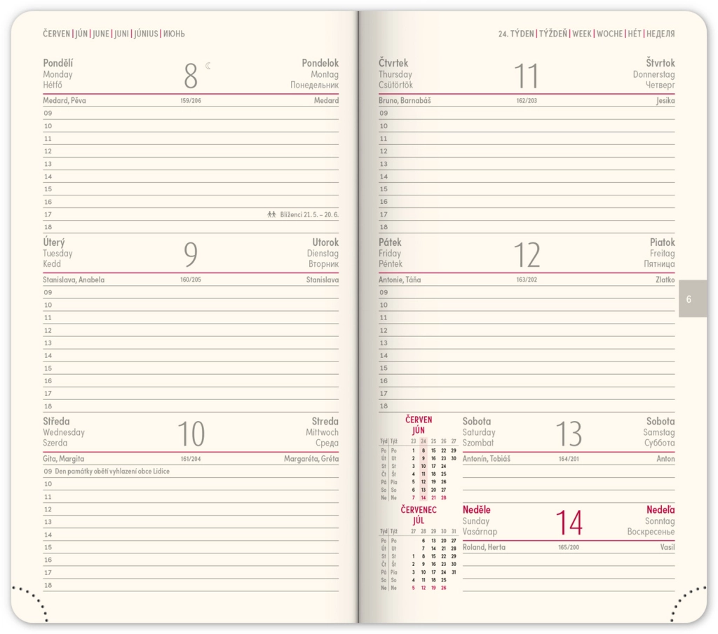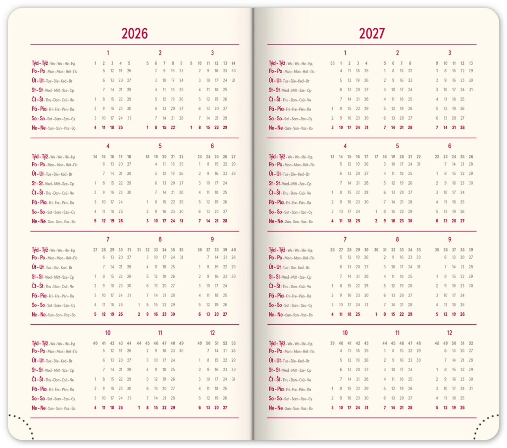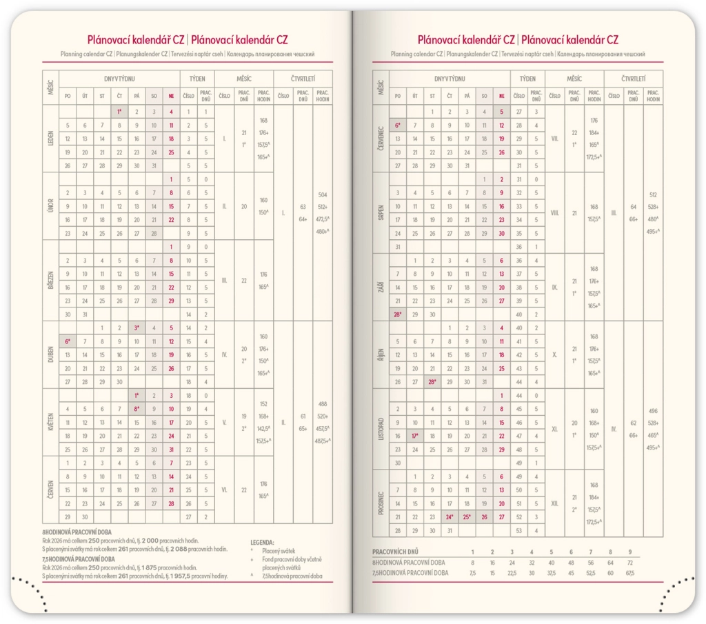 Oplev den nye serie af kalendere Essenza, som ikke kun er prisvenlig, men også miljøvenlig takket være omslaget af økologisk papir. Denne kalender tilbyder en ugeoversigt med tjekkisk-slovakisk kalendarium med supplerende sprog, herunder engelsk, tysk, ungarsk og russisk.