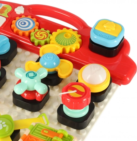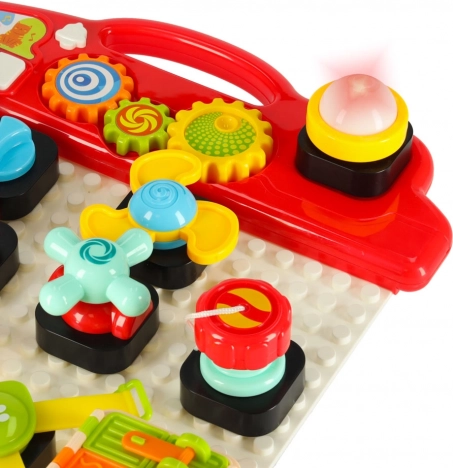- Byggeklods-sæt til konstruktion på tavlen, inklusive farverige roterende knapper.