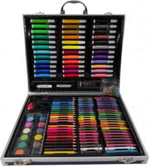 Den kreative kuffert med rumtema er perfekt designet til børn, der elsker at skabe. Den indeholder forskellige kreative redskaber, omhyggeligt organiseret, så hver ting har sin plads, og der altid er orden i kufferten.