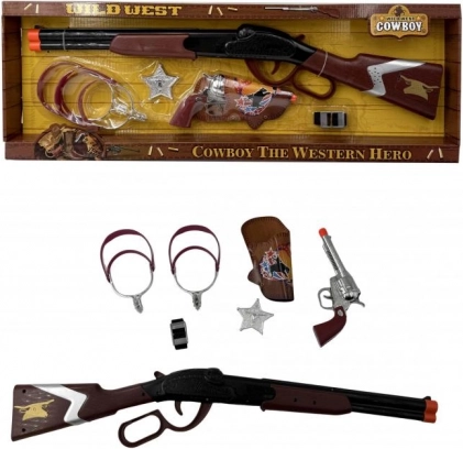 - Stort gevær, revolver med hylster, sporer, sherifbadge