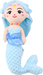 Denne legetøj har et broderet ansigt med et fint smil, små dekorationer på panden og langt blåt hår med udsmykket pandebånd. Hun er speciel med sin baret af farverige perler og tekstil flæser i taljen, der matcher havfrue-stilen.