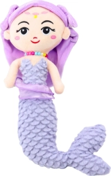 Havfruen har et elegant broderet ansigt og små gyldne og lyserøde accenter på panden med smilende øjne. Det lyselilla hår er pyntet med et stofbånd med sløjfer på siderne, og omkring halsen bæres en farverig perlekæde. Hele designet virker blidt og eventyrligt.