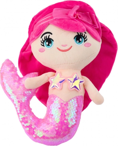 Plys havfruen er udstyret med store, broderede øjne, et smilende ansigt og lyserødt hår pyntet med en sløjfe. Dens imponerende halefinne med glimmer skifter fra skinnende til mat, hvilket bringer glæde til børn og stimulerer deres følesans og fantasi.