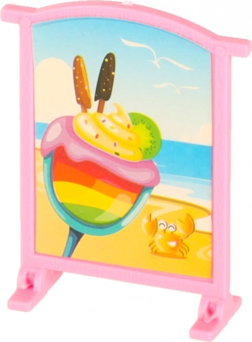 Inkluderer et rigt sæt tilbehør: borde, små stole, parasol, reklameskilt og masser af små dele som bægre, glas, is, kande og bakke. Den lette og robuste plastkonstruktion er skabt til daglig leg hjemme og på farten.