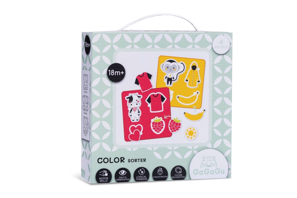 Dette GAGAGU-sæt til farvegenkendelse giver børn en sjov måde at lære på. Fire puslespilsplader i forskellige farver og med forskellig sværhedsgrad hjælper de mindste med at skelne farver og former samt at placere brikkerne de rigtige steder. Billederne af søde dyr og deres yndlingsmad styrker forståelsen af sammenhænge og udvider ordforrådet.