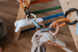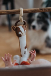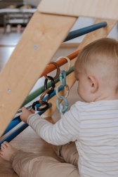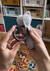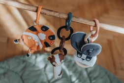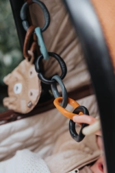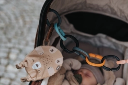 Sammenkædningsring OČKO er designet med vægt på sikkerhed og multifunktionel anvendelse. De tillader nem fastgørelse af legetøj, bleer eller småting til barnevognen. Af flere ringe kan du skabe en sjov kæde til leg og bidning.