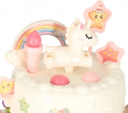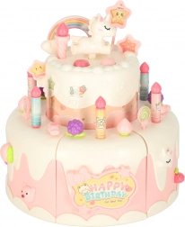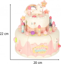 Den to-etagers fødselsdagskage i høj kvalitets plast er en ideel legetøjskage for børn fra 3 år. Den udvikler kreativitet og finmotorik takket være interaktive elementer som rotation og lydeffekter. Sættet indeholder søde figurer af en bjørn og en enhjørning, seks lys og andet tilbehør.