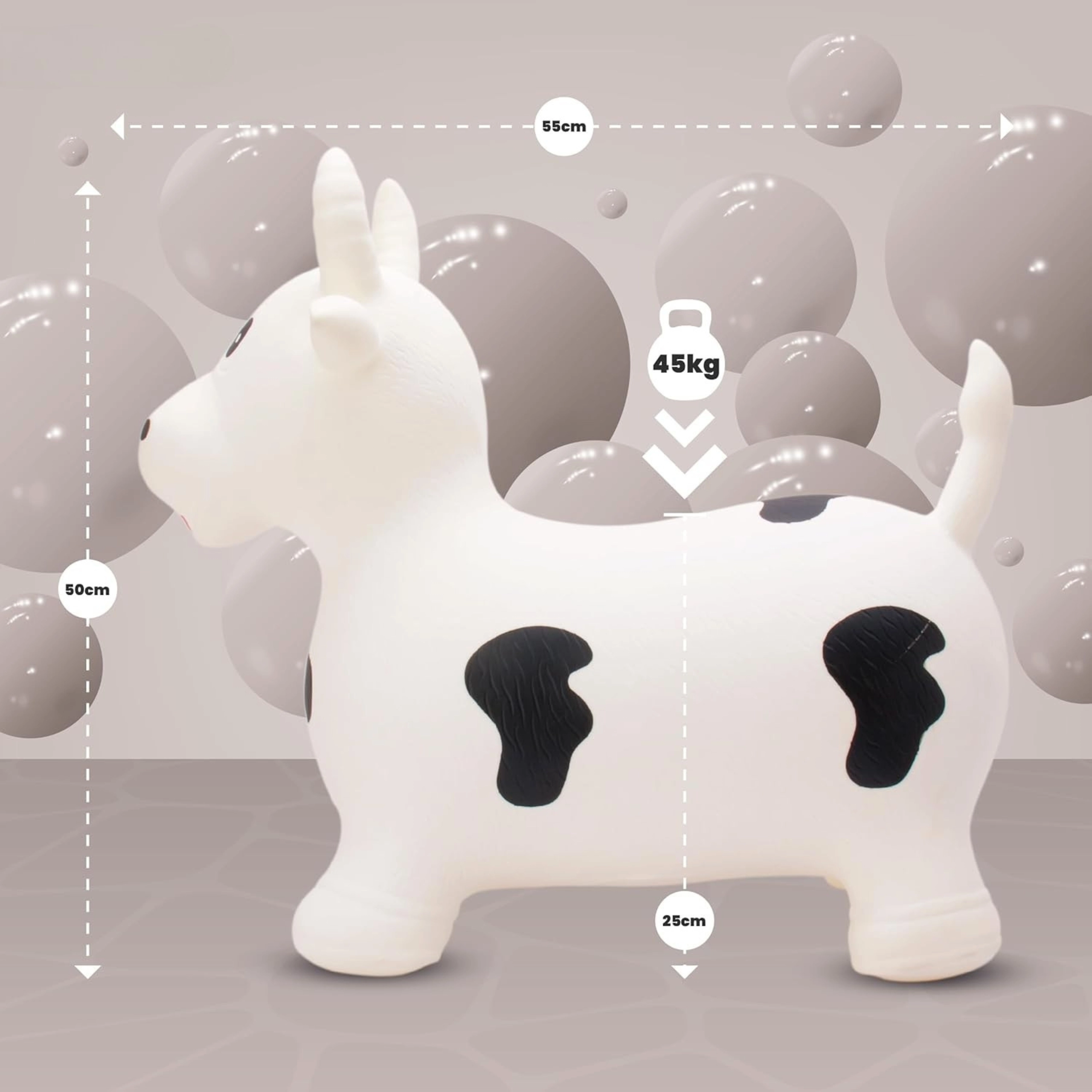 Oplev den hoppende ko med sort-hvide pletter, ideel til at frigive energi, fremme bevægelseskoordination og styrke benmusklerne. For børn fra 12 måneder og med en maksimal belastning på 45 kg. Denne ko er den perfekte legetøj til både indendørs og udendørs leg.