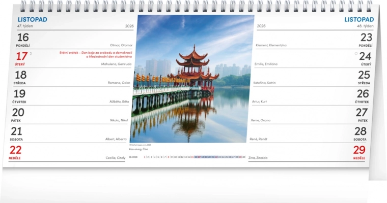 Oplev betagende byer fra hele verden med denne 14-dages bordkalender for 2026. Indeholder tjekkisk kalendarium, helligdage, mindedage og månefaser i en overskuelig to-ugers opsætning.