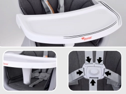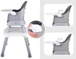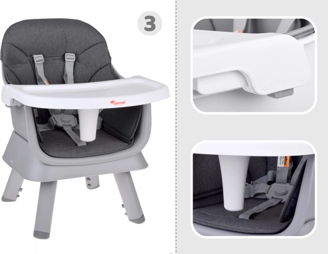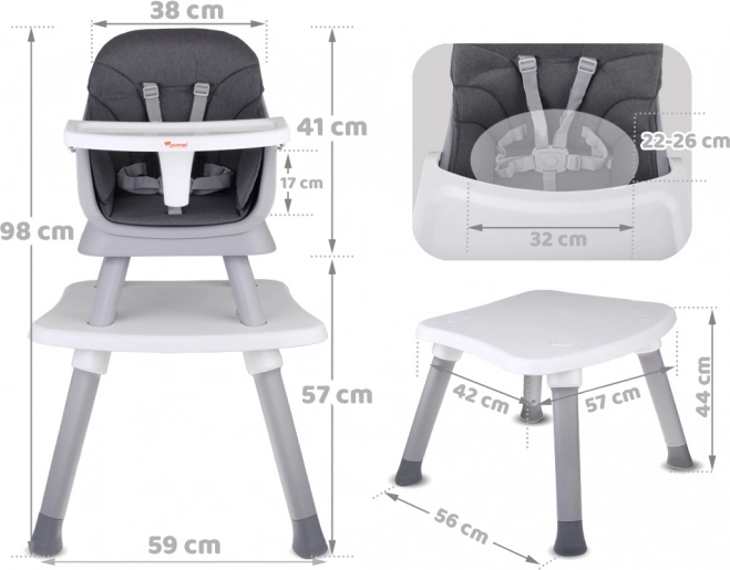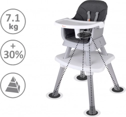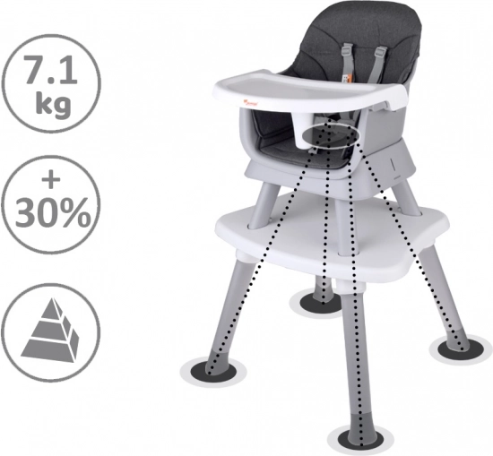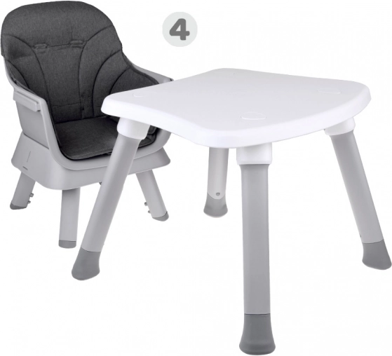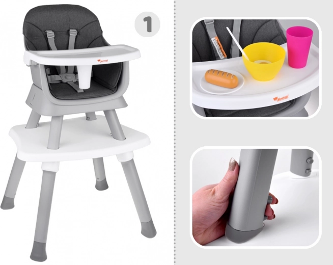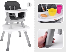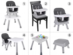 Den multifunktionelle højstol 6-i-1 er den ideelle løsning for forældre, der søger praktisk og stilfuldt udstyr, som tilpasser sig barnets skiftende behov. Fra højstol til selvstændig spisning over børneskammel til et komplet bord- og stolesæt til leg og læring.