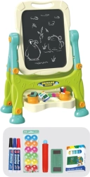 Den dobbeltsidede tavle er udstyret med 360° rotation, hvilket gør det muligt hurtigt at skifte arbejdsflade uden demontering. Højden er tilpasset børns behov, og stabiliteten sikres af et solidt stativ med bred base. En praktisk hylde med farvede beholdere hjælper med at holde orden i tegnetilbehør.