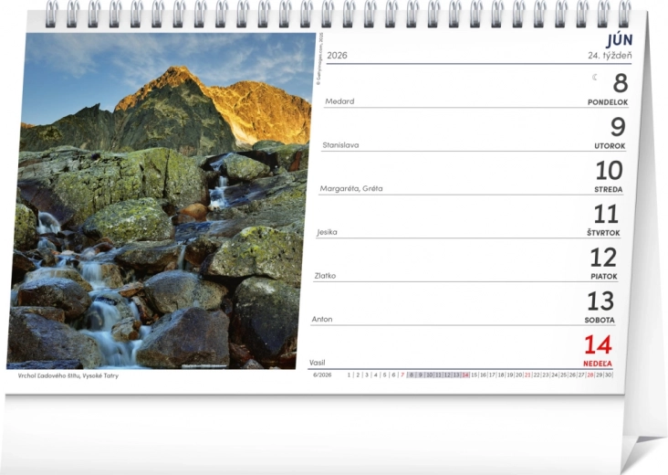 Oplev de smukke udsigter over det slovakiske landskab med en bordkalender for 2026, som indeholder et ugentligt kalendarium med navne, helligdage og mindedage på slovakisk.