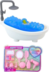 Hoveddelen i sættet er et rummeligt, hvidt badekar med realistisk skum og en gummiand. Der medfølger kosmetisk tilbehør som børste, spejl, hårtørrer og andre nødvendigheder, der udvider legen med daglige ritualer for hygiejne og afslapning.