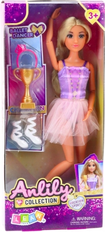 Dukke Anlily Ballerina i Kjole er 30 cm høj og er fremstillet af sikkert og holdbart materiale. Hendes fine ansigtstræk og lange blonde hår gør det nemt at skabe kreative frisurer. I pakken medfølger en gylden pokal, lyserøde ballerina-sko og et hårbånd, som perfekt fuldender dukkens danse-look.