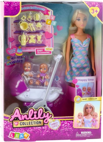 Dukken Anlily med børn og barnevogn bringer en magisk verden, hvor små børn kan opleve omsorgsfulde eftermiddage med pleje af to babyer. Barnevognen i sættet har bevægelige hjul for realistisk leg og er perfekt tilpasset dukkens og babyernes størrelse. Børn kan skabe forskellige legescenarier – fra fodring og bleskift til afslappende gåture i parken eller hyggelige eftermiddage derhjemme.