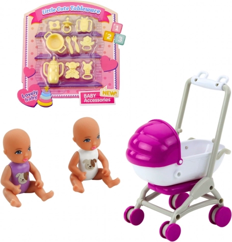 - barnevogn med kaleche, to babyfigurer, børnetilbehør