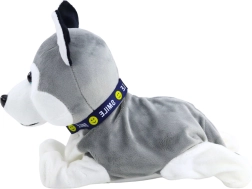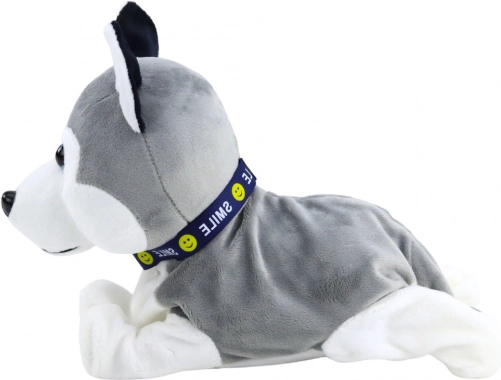 Den interaktive plyshund Husky er det perfekte legetøj til børn, som forener et nuttet udseende med realistiske funktioner. Hunden er lavet af blød og behagelig plys i hvide og grå nuancer, og dens venlige udtryk og blå øjne tiltrækker de mindstes opmærksomhed. Om halsen har den et dekorativt bånd med teksten 'SMILE' og emojis, som giver hunden ekstra karakter.