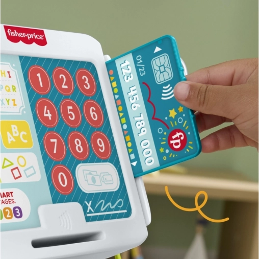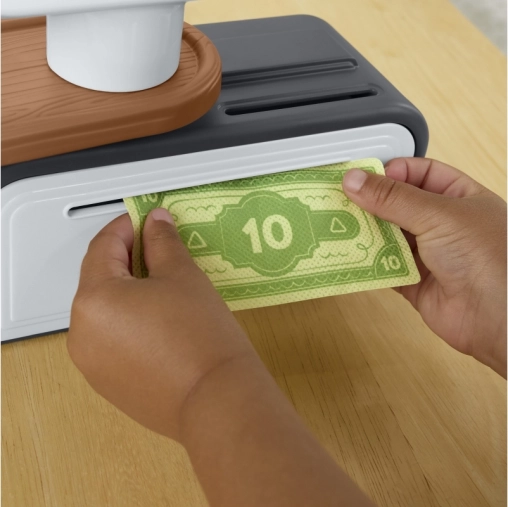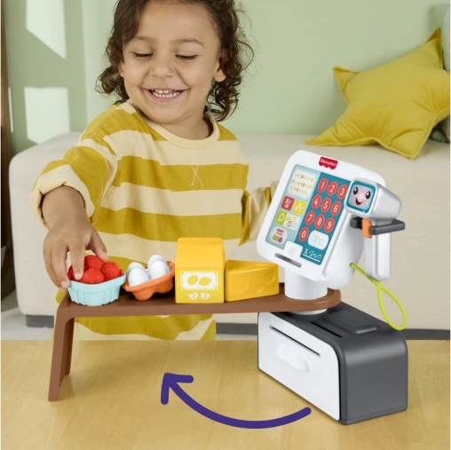 Det talende kasseapparat fra Fisher‑Price gør hver butikleg til lærerig underholdning. Børn kan scanne madvarer, trykke på store farverige knapper, lægge sedler og mønter i skuffen og betale med kort. Den rige lydfeedback med mere end 150 lyde og sætninger understøtter naturlig læring og ordforråd.