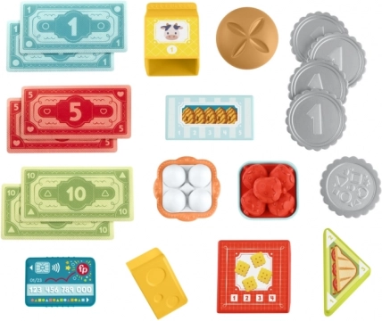 Indeholder sedler, mønter, betalingskort og plastikmad – alt til komplette scenarier med indkøb, scanning og betaling.