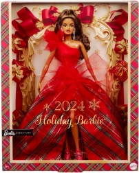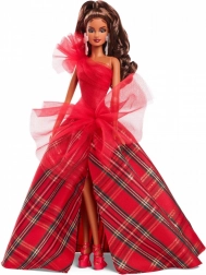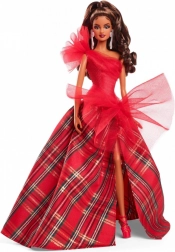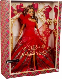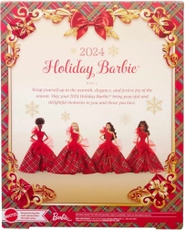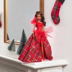 Festlige Barbie 2024 har en imponerende strålende rød corsagekjole med én skulder, smukt kombineret med en voluminøs ballkjole i et klassisk ternet mønster. Store tyl detaljer tilføjer en moderne karakter til den klassiske stil, mens markante øreringe fremhæver den samlede elegance. Dukken er pakket i en udstillingsvenlig emballage, hvilket gør den til en perfekt gave til samlere eller som et unikt element i juledekorationer.