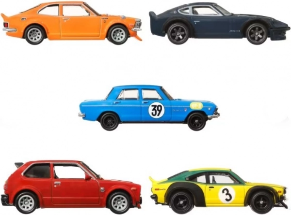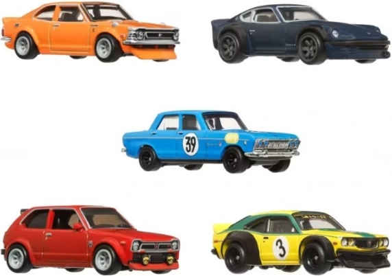 Dette sæt indeholder fem metalbiler Hot Wheels inspireret af ikoniske japanske biler. Det er ideelt for samlere, der søger premium-replikamodeller i skala 1:64 med realistiske detaljer.