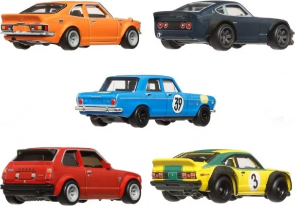 Sæt med 5 metalbiler Hot Wheels inspireret af japanske biler, ideelt for samlere.