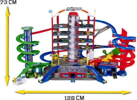 Garagen indeholder også 6 metalbiler og et batteridrevet tog, automatiske sporskifter, en tunnel med krasj-funktion og 2 motoriserede elevatorer. Samlede mål efter montering er 128 x 78 x 73 cm.