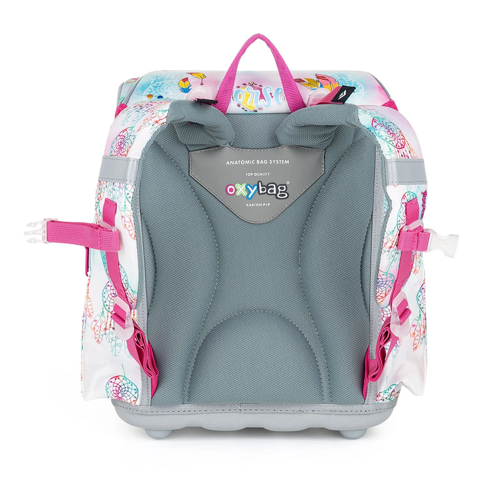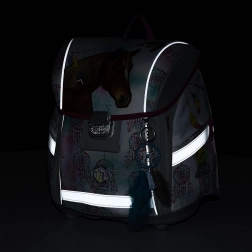 Skolerygsaek fra Premium Light-serien med elegant hestemotiv tilbyder mere end bare et flot udseende. Den er lavet af letvægtsmateriale, hvilket gør, at den vejer mindre end 900 g. Rygsækken er udstyret med komfortabelt, åndbart polstring og brede, polstrede stropper, der fordeler vægten jævnt på barnets skuldre. For endnu større komfort er der justerings- og brystremme.