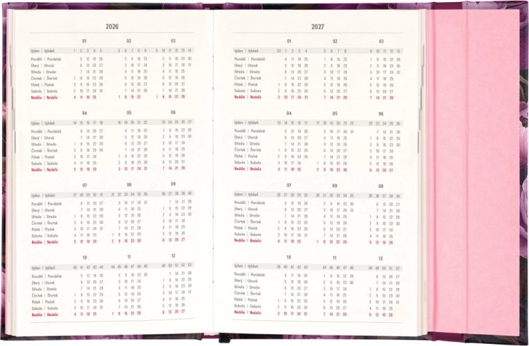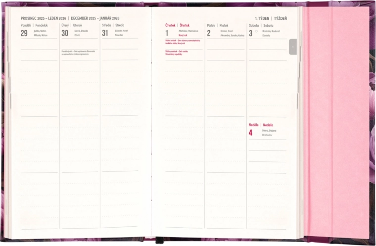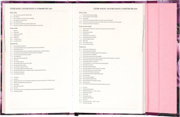 Notique Lilla blomster er ikke kun æstetisk tiltalende, men også meget funktionel. Den indeholder månedlige oversigter, som er ideelle til planlægning af ferier og fridage. Derudover omfatter den en liste over tjekkiske og slovakiske helligdage samt navnedage, så du altid er forberedt.