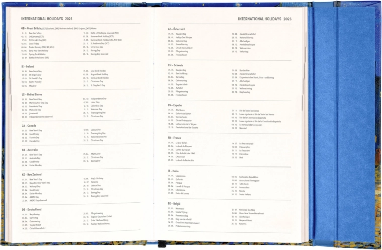 Kalenderen fås i størrelsen 13 x 21 cm, som er ideel til taske eller rygsæk. Den inkluderer også internationale helligdage, hvilket er nyttigt for brugere, der ofte rejser eller har international kundekreds.