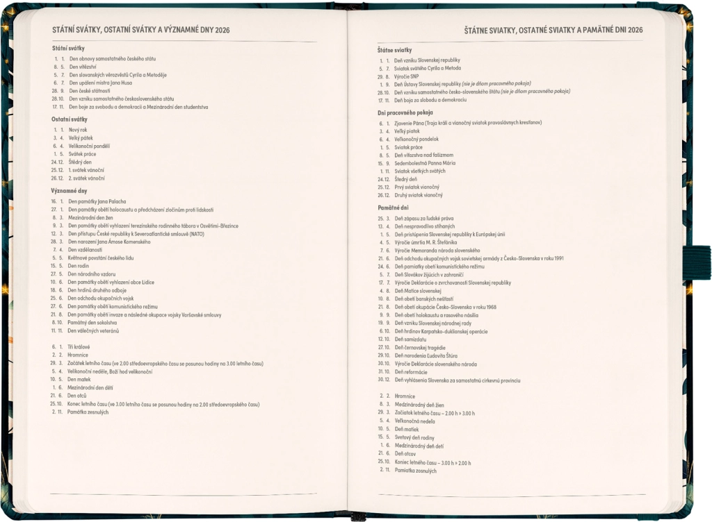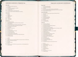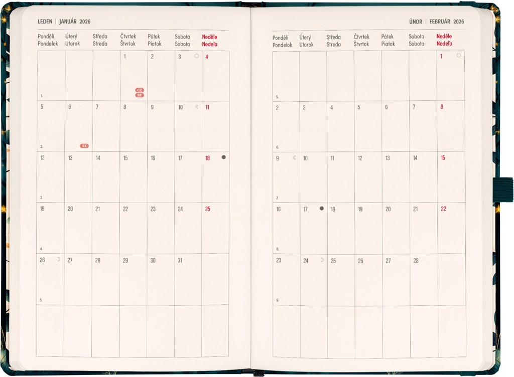 Nyd den ideelle kombination af kalender og notesbog med PLANBOOK. Første halvdel indeholder en fjortendages horisontal kalender med tjekkiske og slovakiske helligdage, som hjælper dig med at planlægge hver dag omhyggeligt. Den anden halvdel, der består af linjerede sider, er perfekt til at skrive alle dine noter, idéer eller projekter ned.