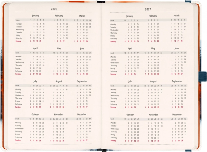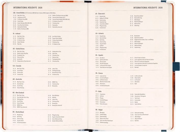 - Kalenderdel: Fjortendages vandret kalendarium med internationale helligdage.