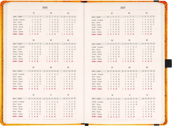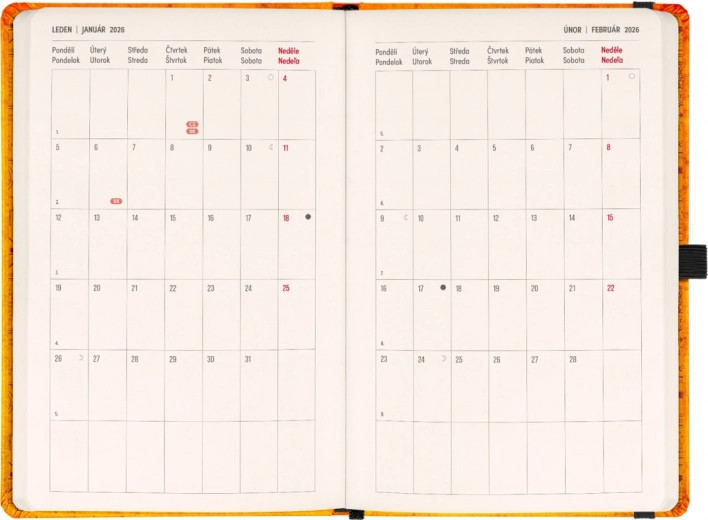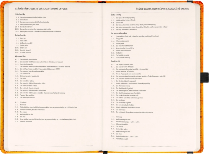 - Fjortendages horisontalt kalendarium med tjekkiske og slovakiske helligdage for nem planlægning.